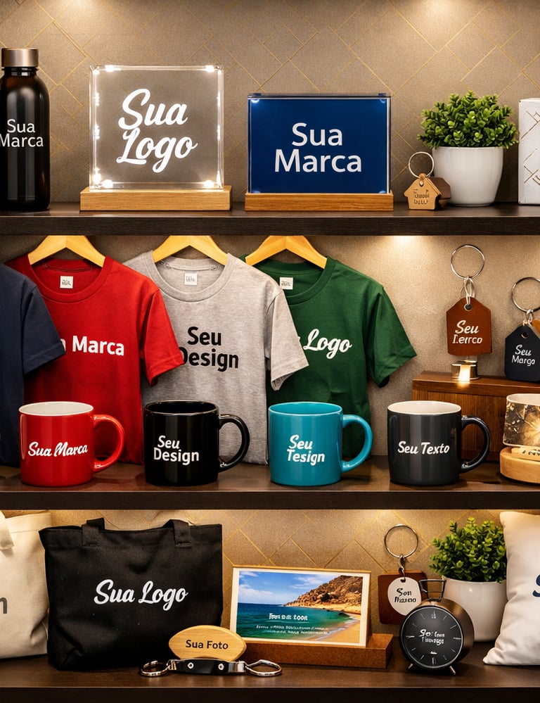 Canecas, garrafas, camisetas, bolsas, toalhas, placas de acrílico, chaveiros e muito mais.